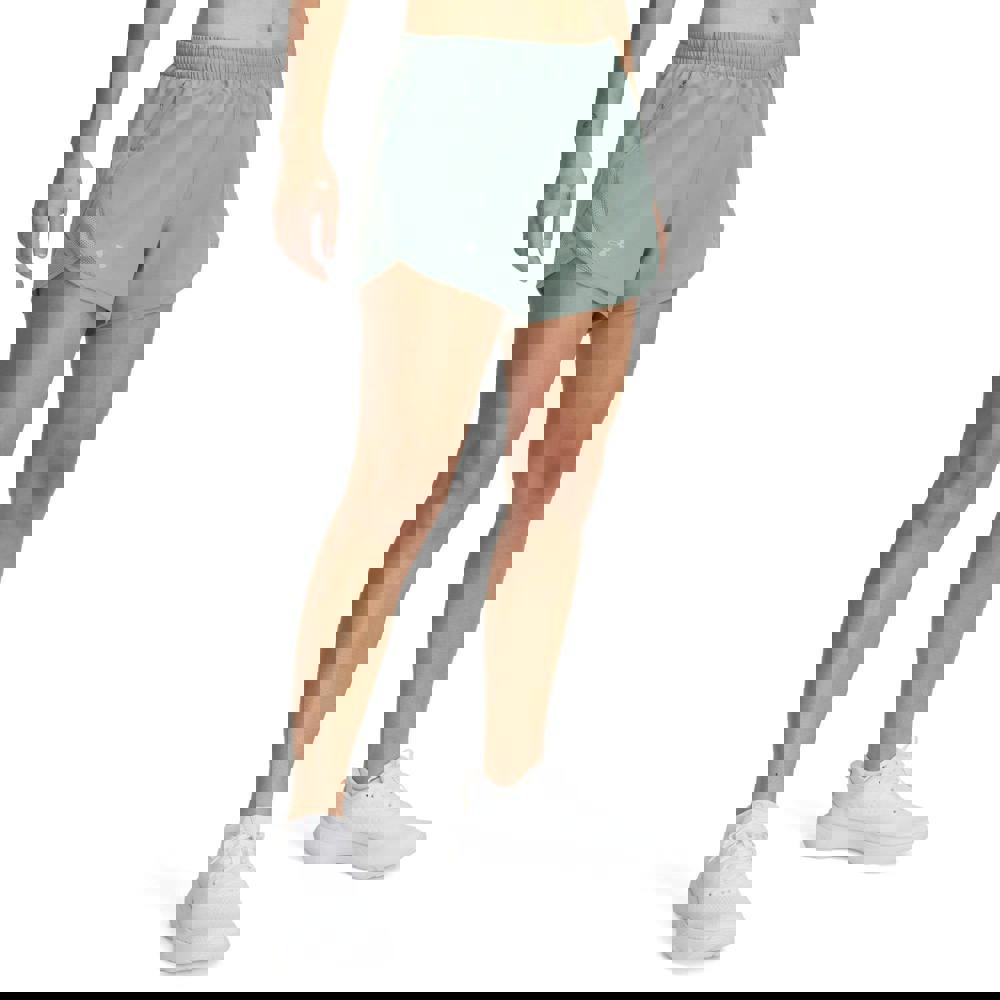 These Under Armour Fly By shorts are made from recycled polyester with a woven finish. In green with a plain design and logo detail, they offer a clean, sporty look for active wear. Mesh panels and an inner brief add structure, while the mid-rise waist is finished with ruching and an internal drawcord for adjustment.