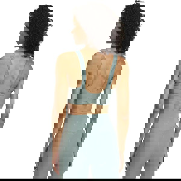 Under Armour Infinity 2.0 Mid sports bra in green with a plain design. Made from 86% polyester and 14% elastane, it combines a scoop neckline with moulded cups and foam padding. Mesh side panels sit alongside an elasticated band, while an adjustable strap allows the fit to be altered. A hook and eye fastening completes the construction.