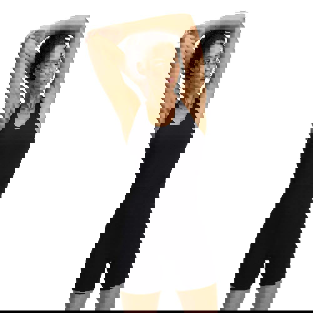 Fabric technology includes breathable, moisture wicking and quick dry properties, alongside a soft handle. Suitable for active wardrobes where stretch and minimal coverage at the shoulders are preferred.