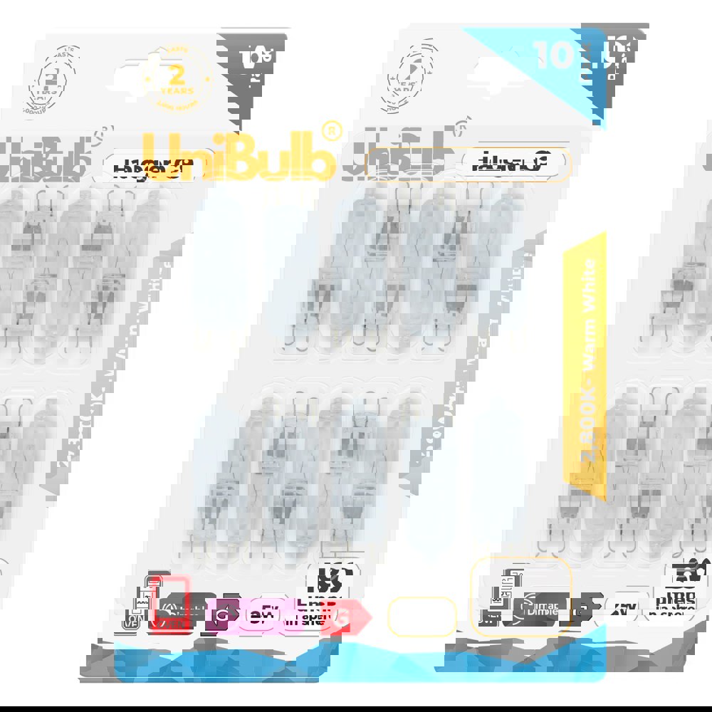 With the UniBulb Halogen G9 Capsule 180lm 25W 2800K (Warm White) – Pack of 10, you're equipped with a versatile lighting solution that offers immediate, effective light in a stylish and compact format, suitable for a wide range of applications.