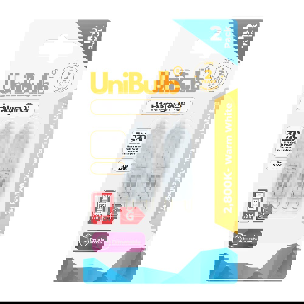 Illuminate your living or working spaces with clarity and warmth using the UniBulb Halogen G9 Capsule 320lm 40W 2800K (Warm White) Light Bulb – Pack of 2. This convenient twin pack is ideal for anyone seeking strong, reliable lighting with a familiar soft white tone. Designed to fit G9-compatible fixtures, these bulbs offer dependable performance, compact construction, and elegant warm light that enhances the atmosphere in any setting.