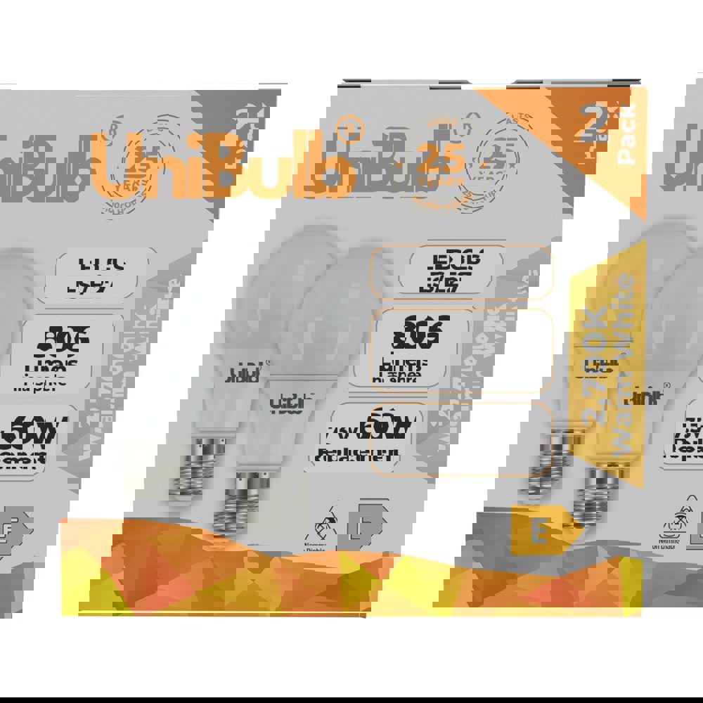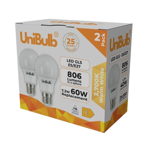 The UniBulb LED GLS E27 806lm 7. 3W 2700K (Warm White) Light Bulb – Pack of 2 offers a dependable lighting solution for a wide range of household and commercial settings. Combining a timeless design with efficient operation, these bulbs provide consistent illumination and are well-suited to everyday use in living rooms, bedrooms, kitchens, offices, and more.