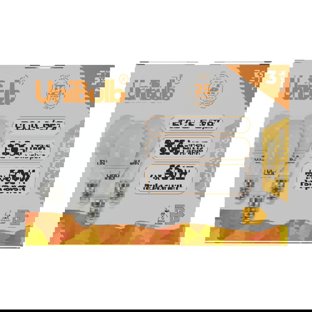 The UniBulb LED GLS E27 806lm 7. 3W 2700K (Warm White) Light Bulb – Pack of 3 offers a dependable lighting solution for a wide range of household and commercial settings. Combining a timeless design with efficient operation, these bulbs provide consistent illumination and are well-suited to everyday use in living rooms, bedrooms, kitchens, offices, and more.