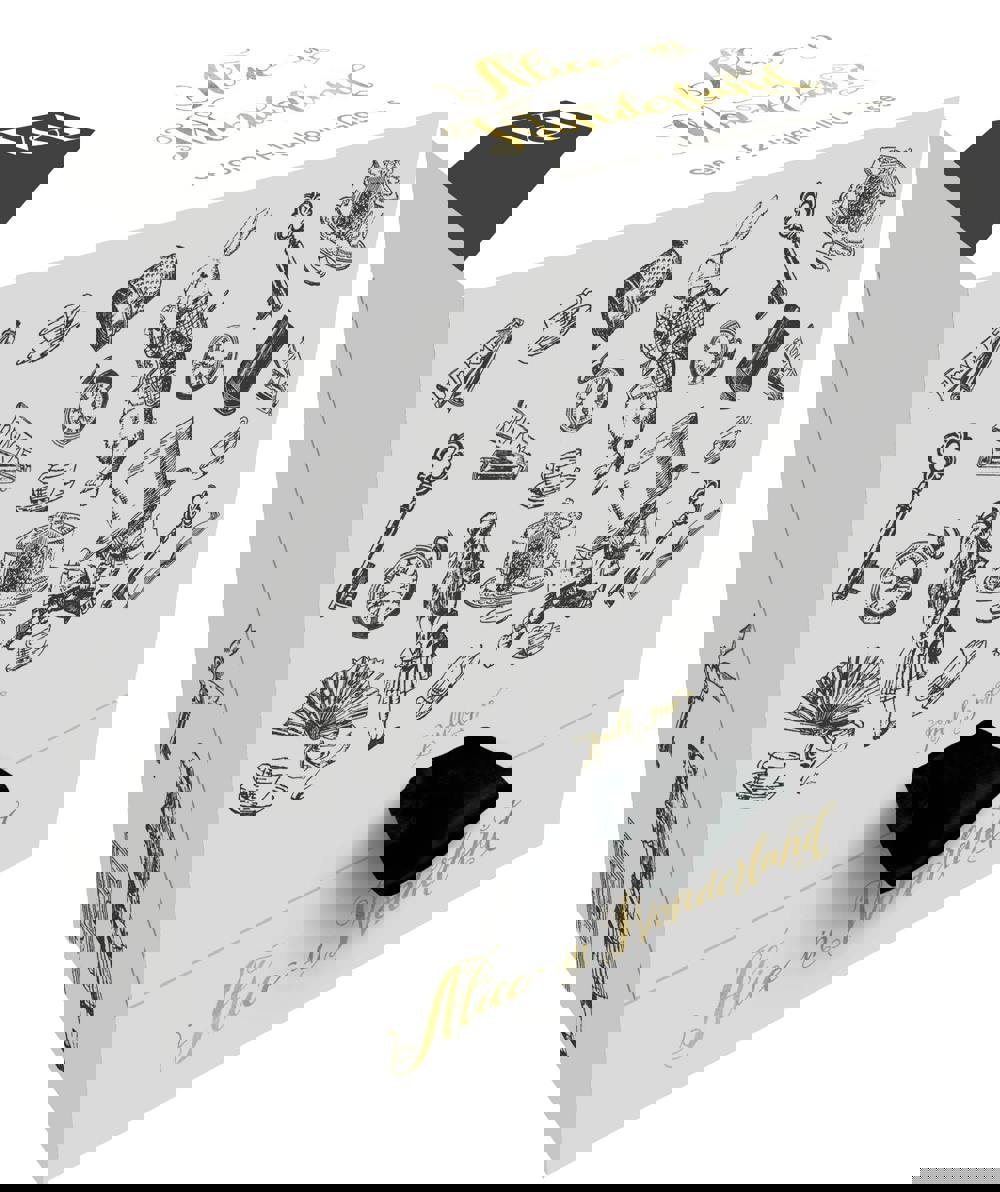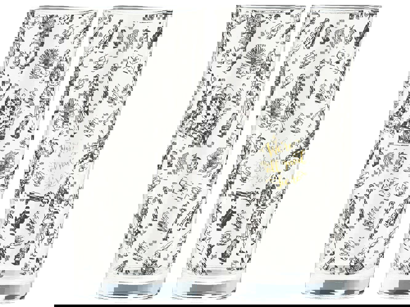 Follow in the footsteps of Alice, by sipping refreshing drinks from this set of two Hatter’s tea party-inspired highball glasses, from the Alice in Wonderland collection, by V&A. These glasses are decorated with a black and white illustrations of Alice, the Hatter, and the White Rabbit, along with tea cups, keys and pocket watches. The designs are inspired by an Alice in Wonderland card game based on artwork by Sir John Tenniel (1820 - 1914). The Hatter’s famous quote, ‘We’re all mad here’ is finished in gold-coloured detail, which shines against the intricate print and complements the gold rim that tops the glass. Perfect for serving chilled soft drinks, these drinking glasses are elegant and eye-catching. Use them to serve orange juice at breakfast, cordial at lunchtime or water during a dinner party too.