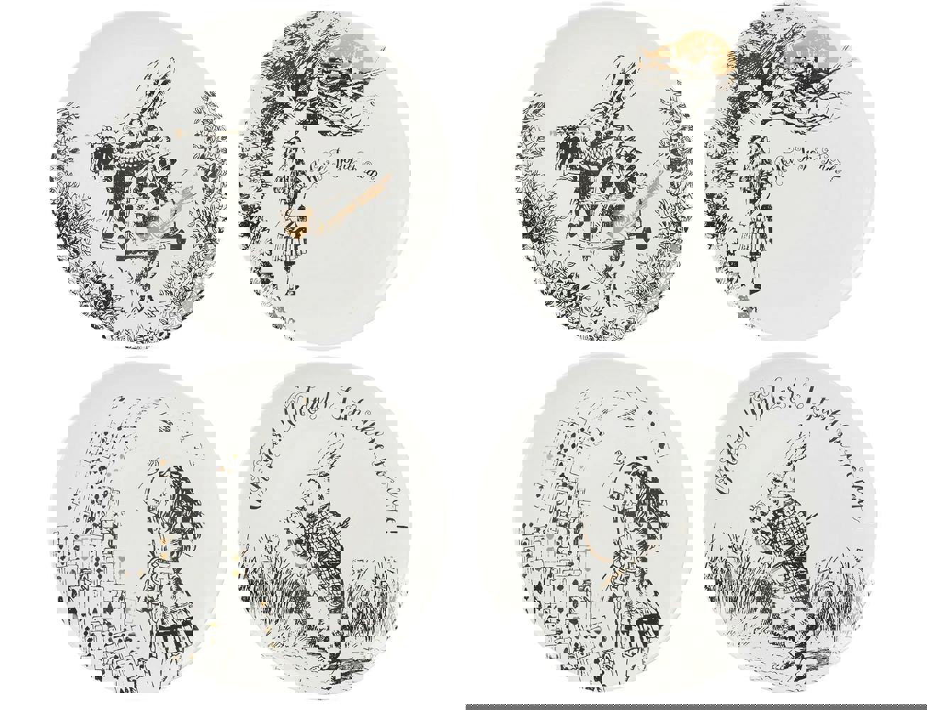 Take a nostalgic journey into Wonderland with this delightful set of four side plates. These side plates will make a wonderful addition to any meal time and are made from fine china, for lasting strength and beauty. They're printed with black and white illustrations, inspired by an Alice in Wonderland card game based on artwork by Sir John Tenniel (1820 - 1914). A hint of gold decal adds a luxurious touch to already beautiful designs, while the iconic ‘oh dear! oh dear! I shall be too late!’ and ‘have I gone mad?’ quotes decorate two of the plates.