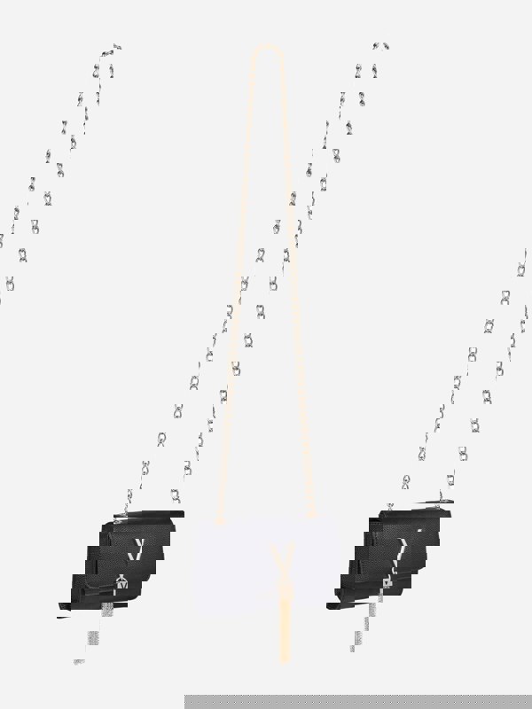 The Valentino Divina Crossbody Bag in black brings a sleek, sophisticated look to everyday essentials. Designed as a compact pochette, it features a pebbled finish and is completed with metal fittings for a refined touch. Inside, the plain coloured polyester lining keeps the interior neat and easy to organise, with a main compartment supported by both a zip pocket and a slip pocket for smaller items.