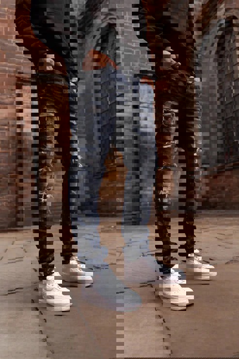 Distressed dark indigo jean