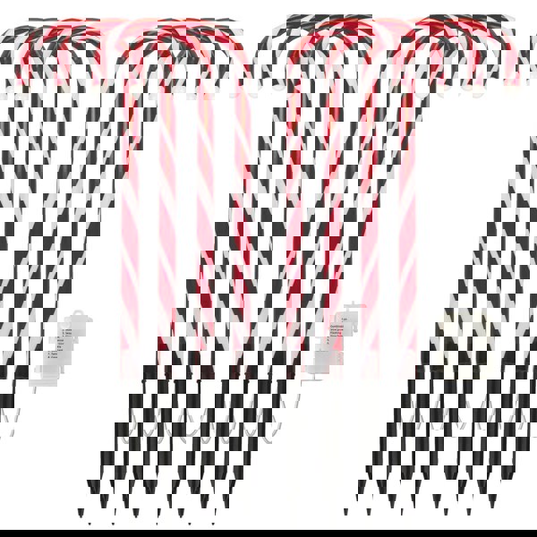 The canes are all connected on one single 4.2m cable – spaced at 60cm intervals – and are powered by 3 x AA Batteries (not included). There is a choice of 8 different lighting sequences such as Twinkle, Flashing and Fixed controlled via a simple button press on the battery case. The lights are programmed to run for 6 hours from each button press followed by a period of 18 hours off and then automatically coming back on again. This can be overridden with a press of the button. Each Candy Cane is supplied with a detachable ground stake to ensure your lights remain firmly fixed when in position and all materials are waterproof so you can leave out in your garden whatever the weather.