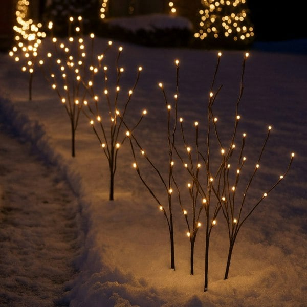 With eight lighting modes available, you can adjust your display to match the mood of your celebrations, whether you prefer a gentle twinkle or a steady warm light. The lights are linked together on a durable 4. 2m weatherproof cable, ensuring reliable performance outdoors throughout the festive season. An additional 5m power cable offers flexibility when positioning, while detachable ground stakes secure each branch in soil, grass or gravel with ease. Standing 74cm tall with stakes inserted, each branch rises 60cm above ground level, providing the perfect balance of impact and elegance.
