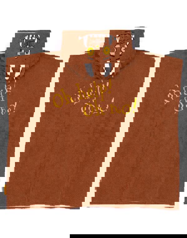 The brown towel is packed with detail, as it features the Mouse with "It's a Gruffalo" graphics across the front and with "Oh help! Oh no" graphics across the back, complete with a Gruffalo character hood that has adorable 3D horns.