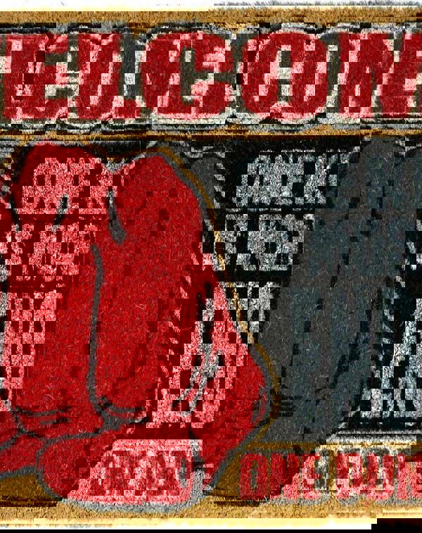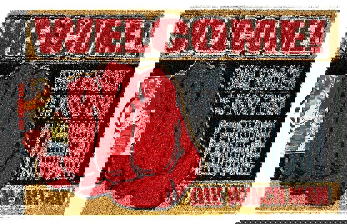 A detailed 'Welcome' sign can be seen along the top, and white text of 'one knock is more than enough!' in the center of the mat, contrasting with the black background.