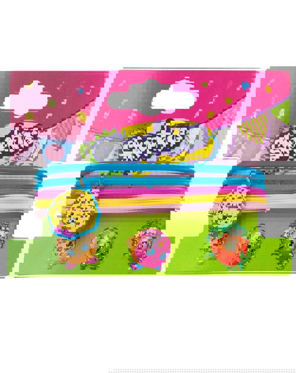 Dress up in Shopkins style with these sweet children's jelly bracelets! Made from five thin rubber bands in blue, pink, and yellow, this bracelet pack sees the popular Shopkins character Kooky Cookie as a small dangling charm attached to the blue bracelet band.