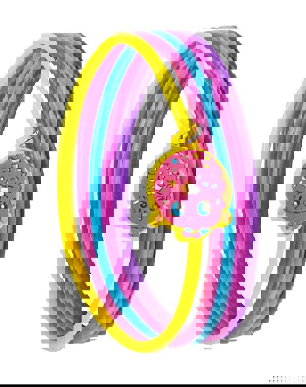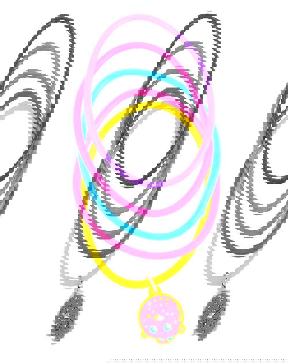 Dress up in Shopkins style with these sweet children's jelly bracelets! Made from five thin rubber bands in purple, pink, blue, and yellow, this bracelet pack sees the popular Shopkins character D'Lish Donut as a small dangling charm attached to the yellow bracelet band.