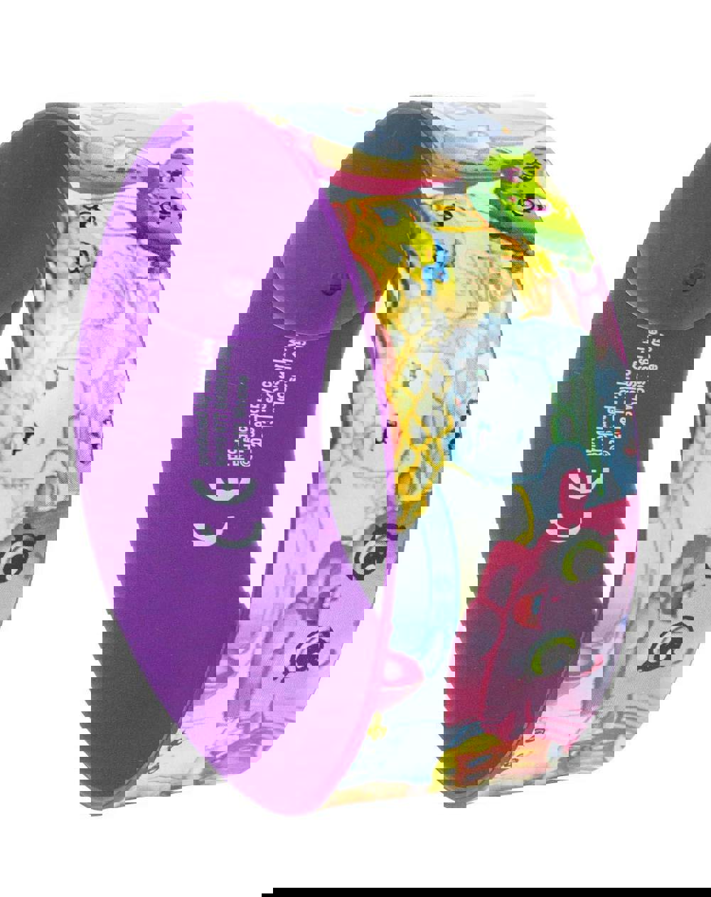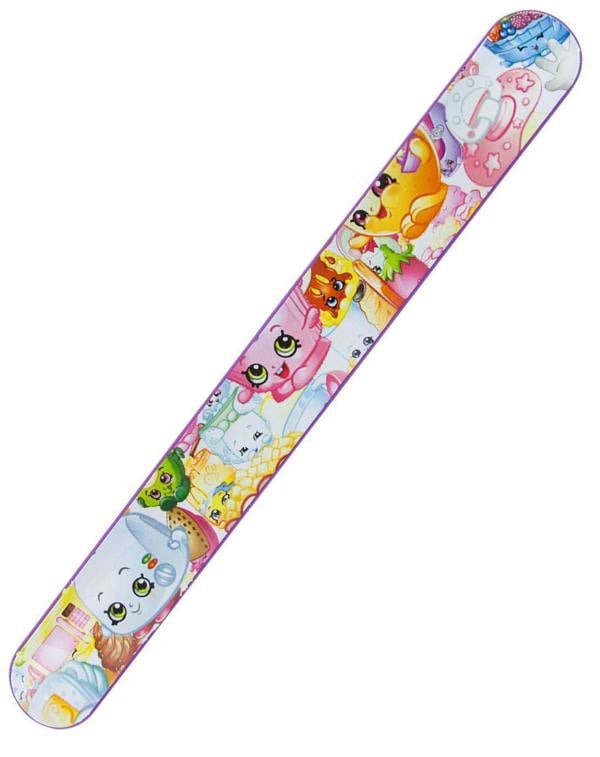 This wrap band (also known as slap band) comes in bright purple with a Shopkins design across the front.