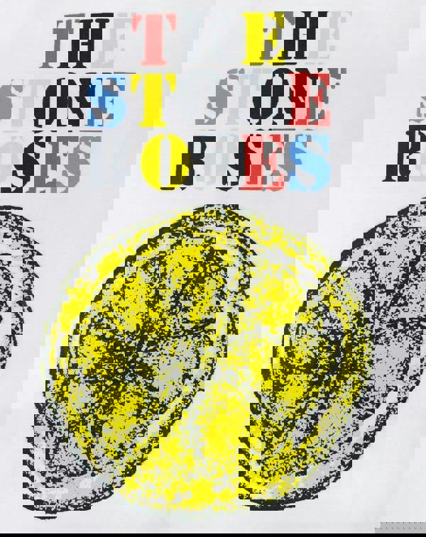 The striking print sees the colourful lemon icon along with The Stone Roses logo in black, red, yellow, and blue lettering set against the crisp white of the vest.