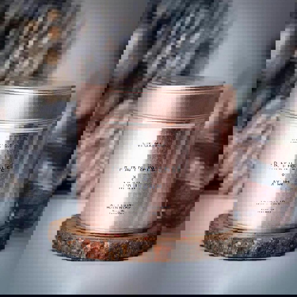 The Frankincense & Myrrh Coconut Wax Candle is depth in a jar. Woody and sophisticated, it blends rich resins with soft bergamot and lily of the valley, layered over sweet musk and warm undertones that feel both comforting and elevated.