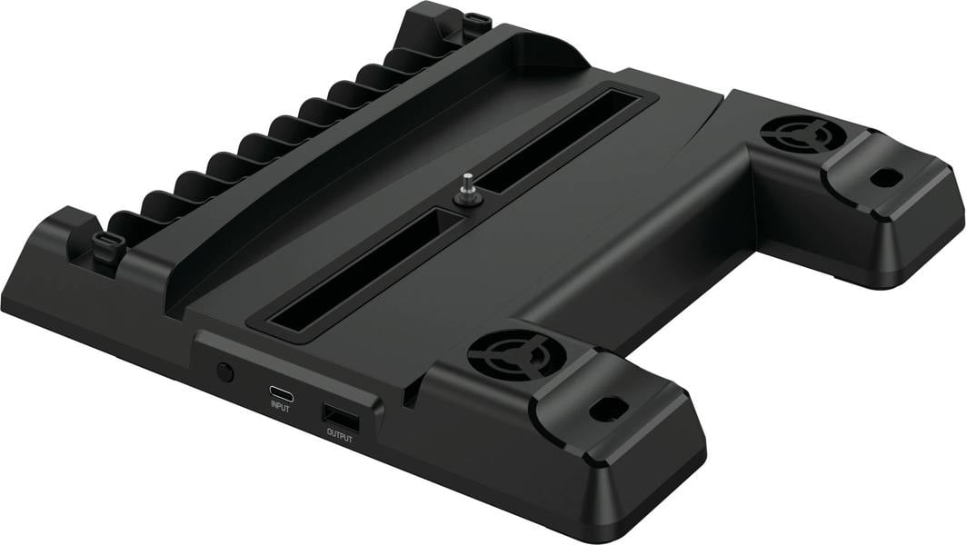 Two integrated charging docks hold DualSense controllers upright, so they stay ready to pick up without extra cables on your desk or TV unit. For longer sessions, two quiet cooling fans help regulate console temperature, with an on/off switch to control when they run. There’s also space for your collection, thanks to 10 media storage slots for PS5 games, Blu-rays or DVDs. Connection is via USB for straightforward setup.