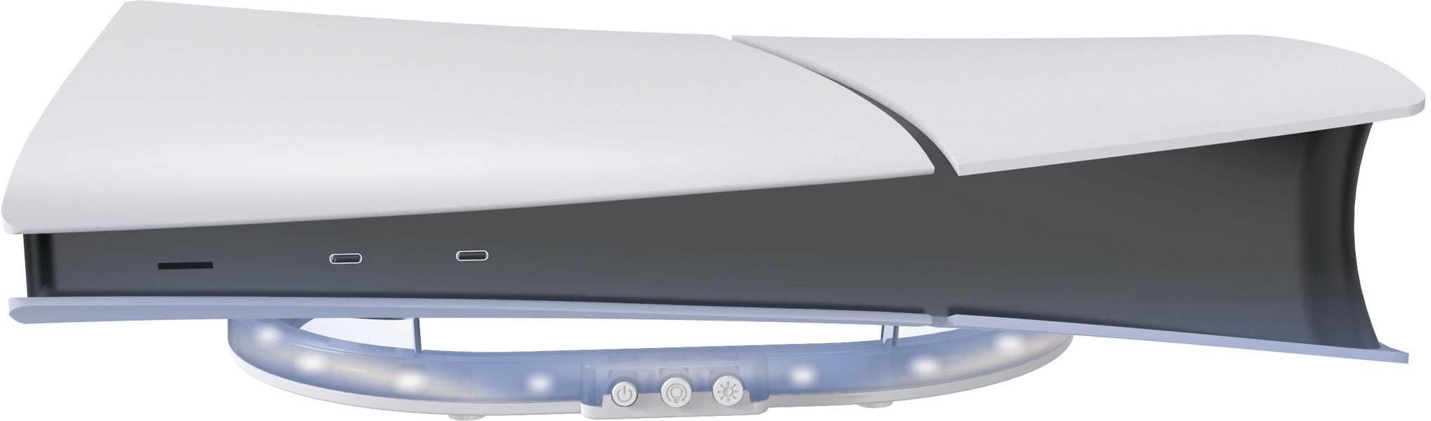 Integrated LED lighting offers a choice of eight colours, with multiple display options to suit the mood of your room. Controls sit on the front panel, so power, brightness and colour changes are quick to adjust without reaching behind the console. Power is supplied via USB; connect the cable to the rear of your PS5 for a straightforward setup, with the lighting turning on and off alongside the console.