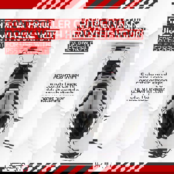 Charging is kept simple: connect your USB controller cable to the underside of the dock and charge directly from the console. An LED indicator shows the controller’s charging status, so it’s easy to check at a glance. A retractable hook sits beneath the dock to hold your headset, folding back when not in use and compatible with most headsets. Once mounted, access to the console’s ports, vents and buttons is retained. Compatible with all official PS5 controllers, excluding the Edge controller.
