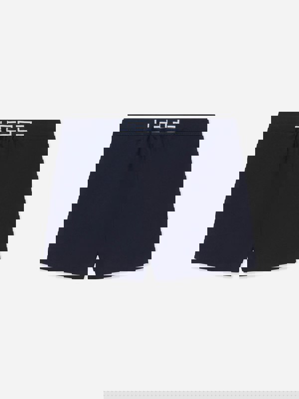 These baby girls shorts from Versace come in navy gabardine with signature Medusa detailing. The front fastens with Medusa buttons, while a Greca insert at the back adds an elasticated finish. Gold Medusa hardware and front side pockets complete the look, with a concealed side zip closure for a neat profile.