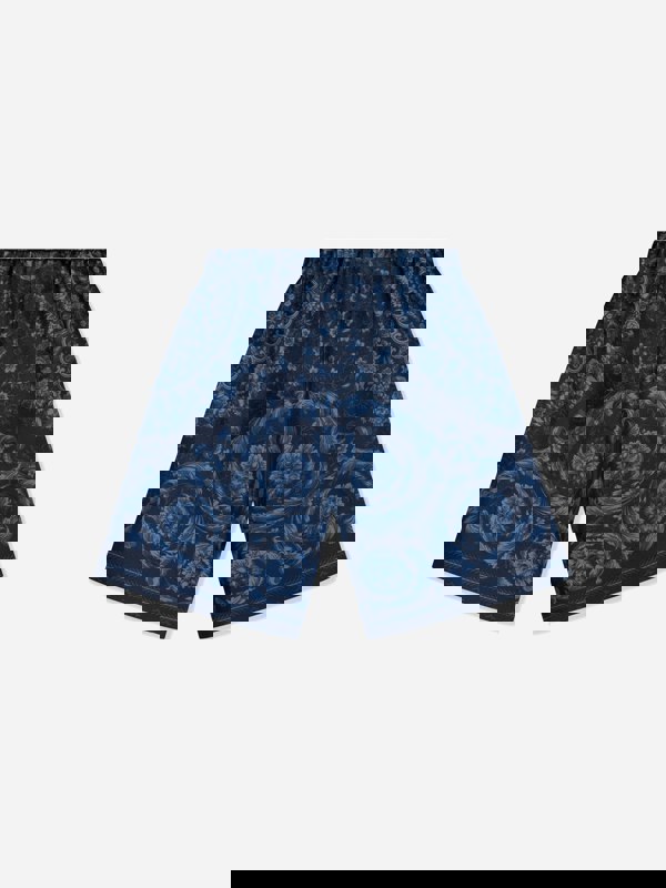An elasticated waistband keeps the finish simple and practical, while the all-over print delivers a strong graphic look in a deep navy tone.