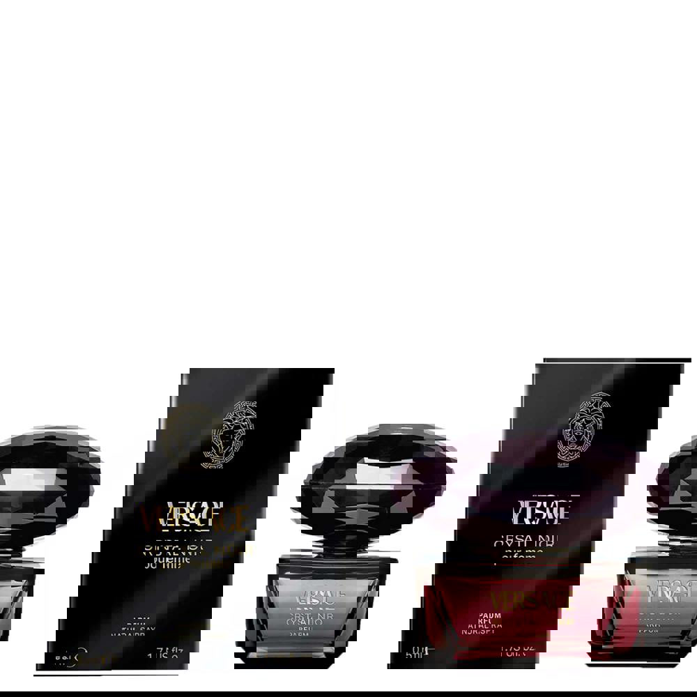 Inspired by the brilliance and creativity of Versace fashion, Crystal Noir Parfum is a journey of intensity and desire that pushes boundaries and transports to a world of luxury and enchantment. The fragrance opens with bright, sunny citrus notes evoking rich Middle Eastern sunsets, with spicy peppercorn providing a facet reminiscent of bustling sensory-rich marketplaces. Bewitching floral notes lie at the heart as a tribute to classic Versace femininity. Then, like the train of a sumptuous evening dress, the fragrance rounds off with a final swish of depth and intensity produced from woody amber base notes.