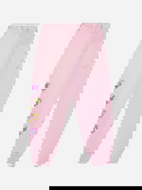 Versace girls joggers in pink with a safety pin motif. Made in Italy, they bring a distinctive Versace print to a casual wardrobe piece.