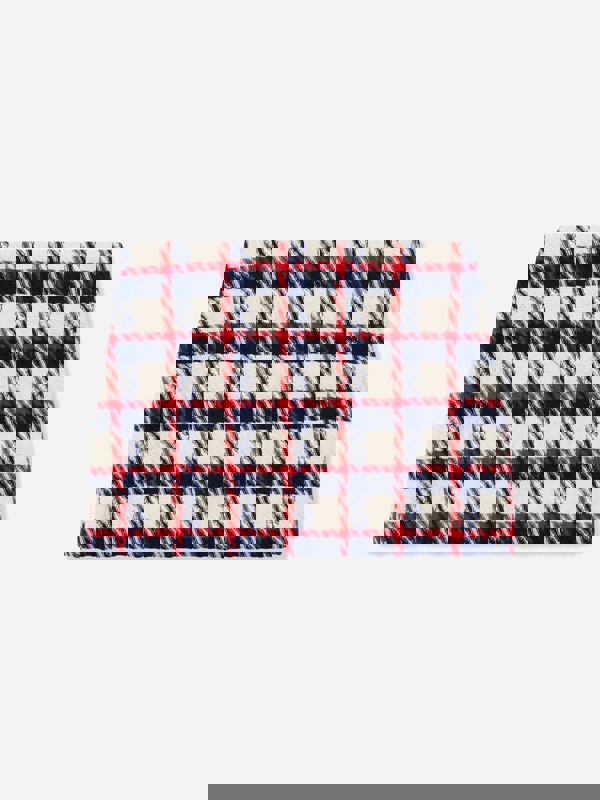 Versace girls tartan skirt in red and white, made in a cotton-blend tweed. The design pairs a classic tartan check with signature Medusa hardware and a front button closure. A concealed side zip provides an additional fastening, while the skirt is finished with a full lining in cupro.