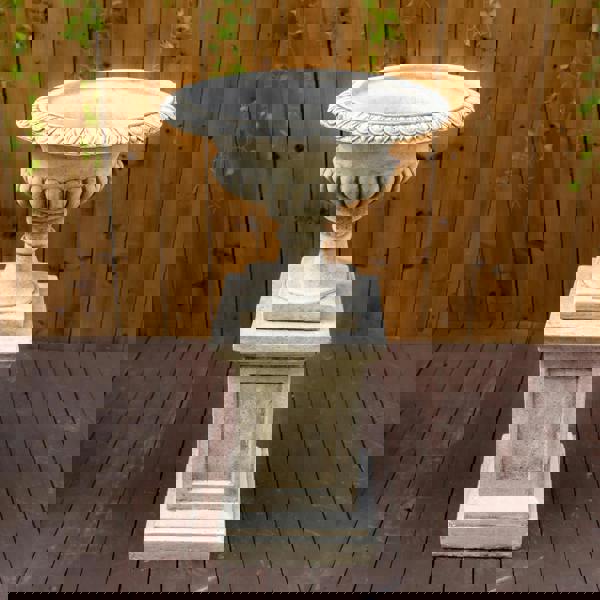 A beautifully detailed, large stone cast Victorian urn complete with matching plinth, designed to be a striking garden ornament and a true centrepiece wherever it is placed. Solid and heavy, it is suitable for both indoor and outdoor use, perfect for gardens, patios, conservatories, or reception areas. Expertly hand-finished to create a unique, perfectly aged appearance, this elegant urn exudes classic Victorian charm. Frostproof and durable, it can remain outdoors year-round, just ensure it does not hold excessive water during freezing weather.