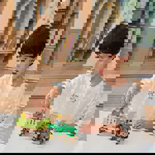 Ignite your child's imagination with our delightful wooden farm tractor playset. This charming set includes a bright green wooden tractor with a detachable trailer, perfect for transporting farm essentials.