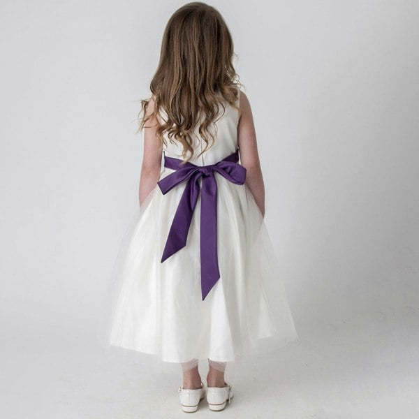 This beautiful Ivory flower girl dress features a simple classic style upper bodice, waistband and nipped in at the waist for a full looking skirt. This dress is ideal for any formal occasion.