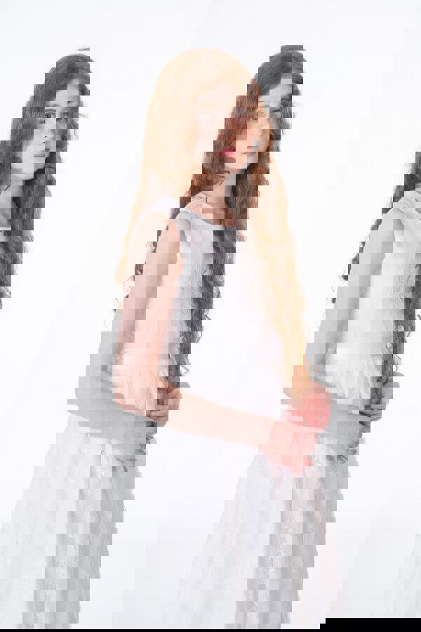 This stunning pure white dress has a full lace overlay with a delicate fringed hemline. A removable satin sash is to the waist with a large flower attached. Sleeveless bodice with a discreet zip fastening. The stiff net underlay to create fullness with lining to complete this simply elegant design.