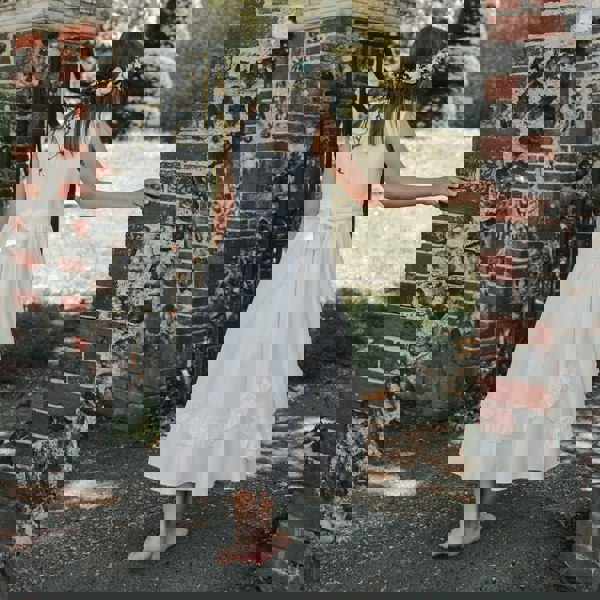 A beautiful Ivory classic dress gives a very English Princess vibe. The sleeveless satin feel dress features a fitted bodice, with waistband sash. Discreet zipper and rear ties. The pretty skirt has a net underlay for a fuller look, ruched detailing along the skirt with pretty pin tuck effect rosettes near the hem.