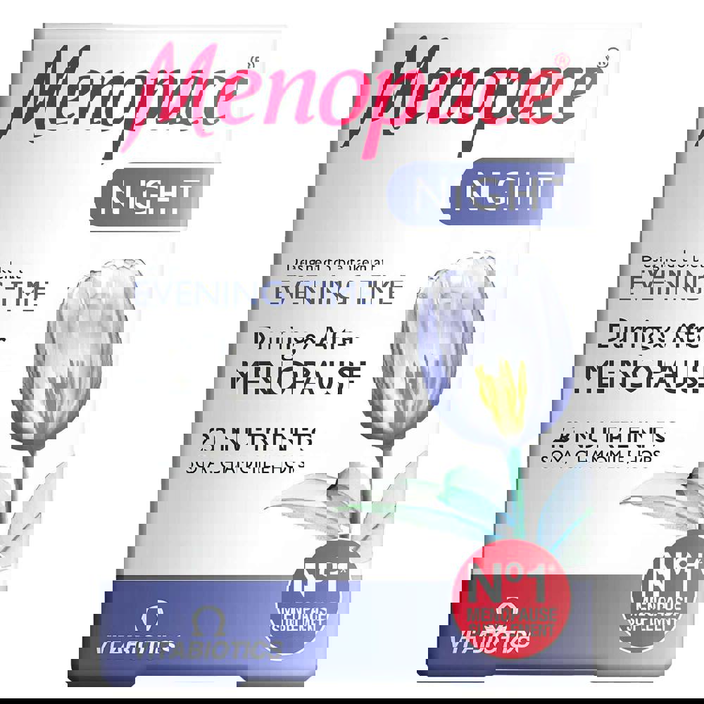 From Vitabiotics, Menopace Night is a menopause supplement created for use during and after the menopause, with a scientifically formulated blend of 24 nutrients. Designed to be taken in the evening, it combines the original Menopace micronutrient tablet formula with Camomile and Hops extracts, plus 5-HTP (Hydroxytryptophan) and extra Soya Isoflavones from Soya extract.