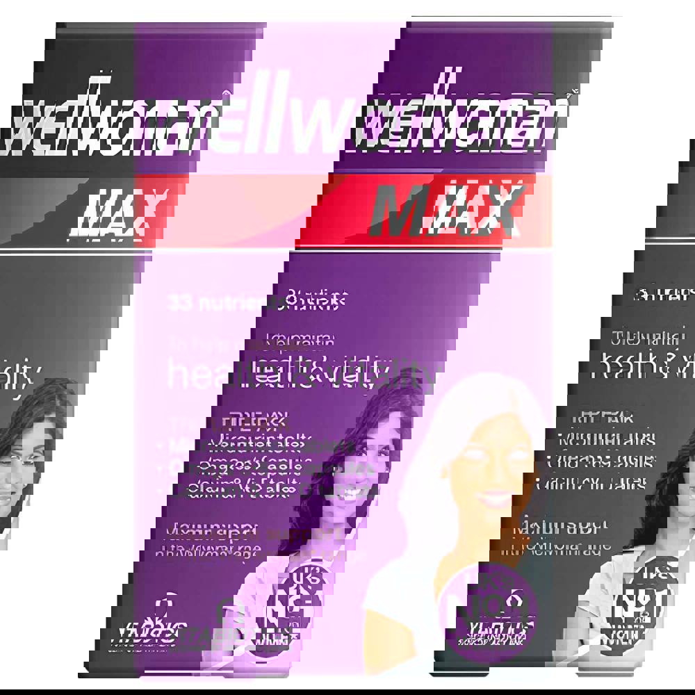 Wellwoman Max is formulated with specific nutrients which have been specifically chosen for their role in supporting all round female health including pantothenic acid which contributes to normal mental performance. It also includes B vitamins: thiamine (vitamin B1), B6 and B12 which contribute to normal energy release, ideal for women who lead hectic lifestyles, juggling work, family and social commitments.