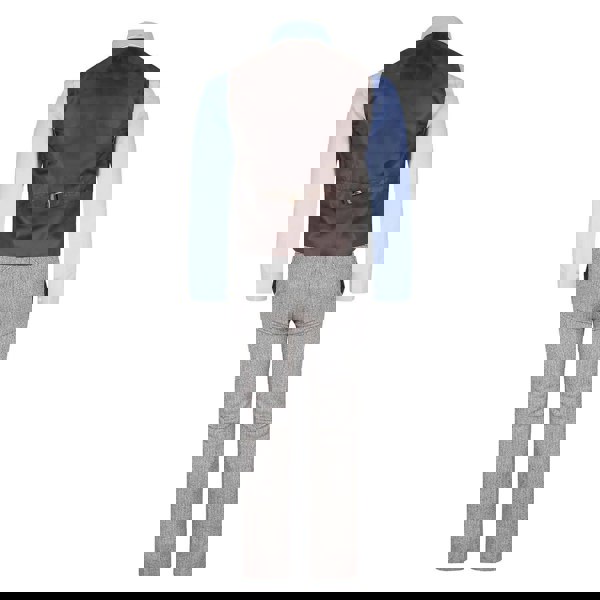 The lined herringbone waistcoat, features a small pocket with a matching brown mock handkerchief and an adjustable buckle at the rear for a perfect fit.