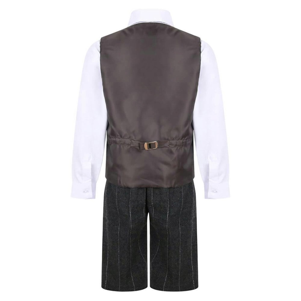 This 4 piece suit comes with tweed herringbone waistcoat, elastic shorts, white shirt and tie, with stitched pocket.
