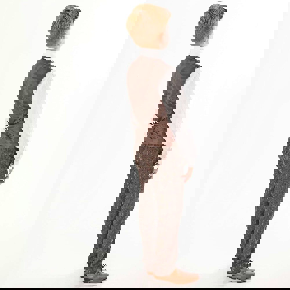 This 4 piece suit comes with brown tweed waistcoat, elastic trousers, white shirt and tie, with a stitched pocket.