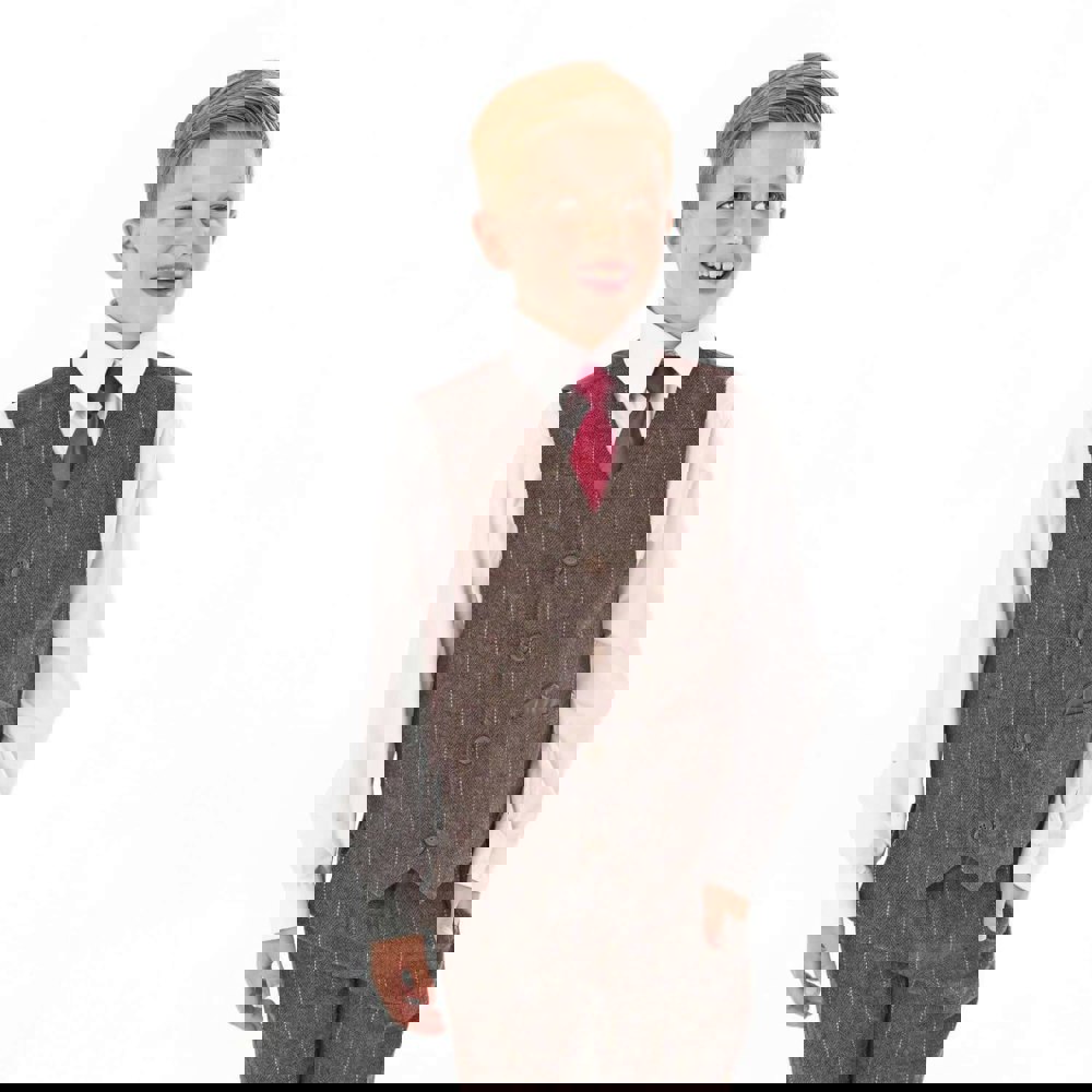 Detailing on each piece, a brown tweed fabric waistcoat, woven with a herringbone pattern and overlaid with a check design, fully lined. The waistcoat features a pocket with a contrasting mock handkerchief, 3 brown centre buttons, a plain dark brown back, adjustable strap/buckle on the back for perfect fit. The trousers are also matching tweed herringbone check trousers, button fly, double pockets, belt hoops, elasticated on the rear. The long-sleeved white shirt, displays full-length centre buttons, buttoned cuffs, and a turn down-collar, a perfect match. The satin effect burgundy tie, has an elasticated neckband, complimenting the suit perfectly.