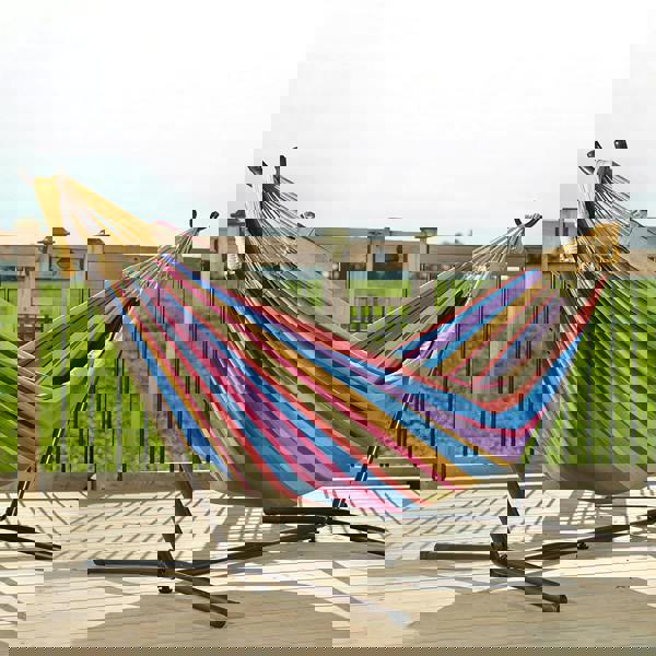 Unwind in Comfort with the Best-Selling Universal Hammock Stand and Double Cotton Hammock. Experience the perfect blend of durability and relaxation with this premium hammock. Crafted from breathable cotton and reinforced with durable polyester end strings, it’s built to last. The included powder-coated steel stand is easy to assemble and features a smooth, damage-free finish for effortless portability. Whether you're enjoying a quiet weekend getaway or lounging in your backyard, this hammock set transforms every moment of leisure into something extraordinary.