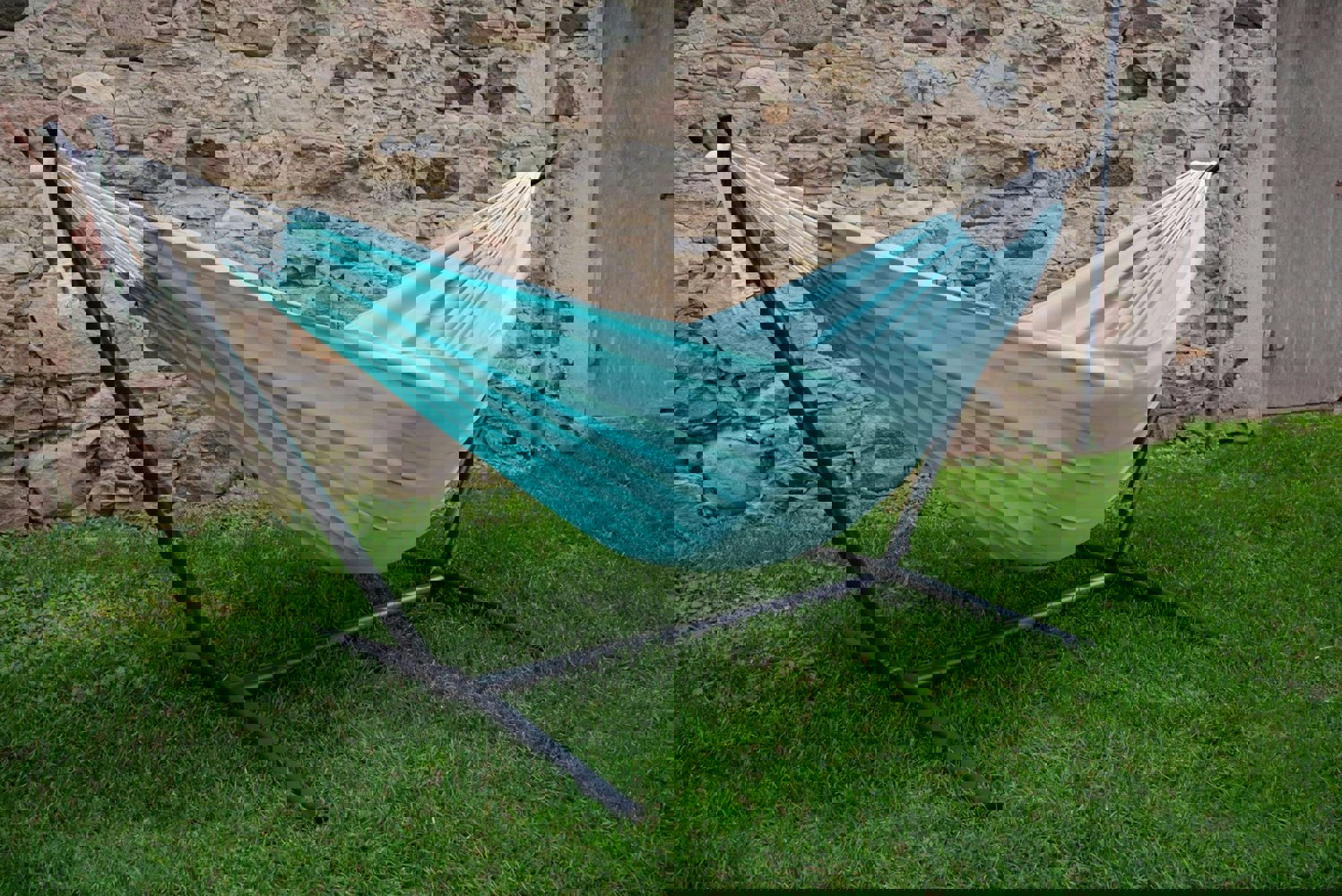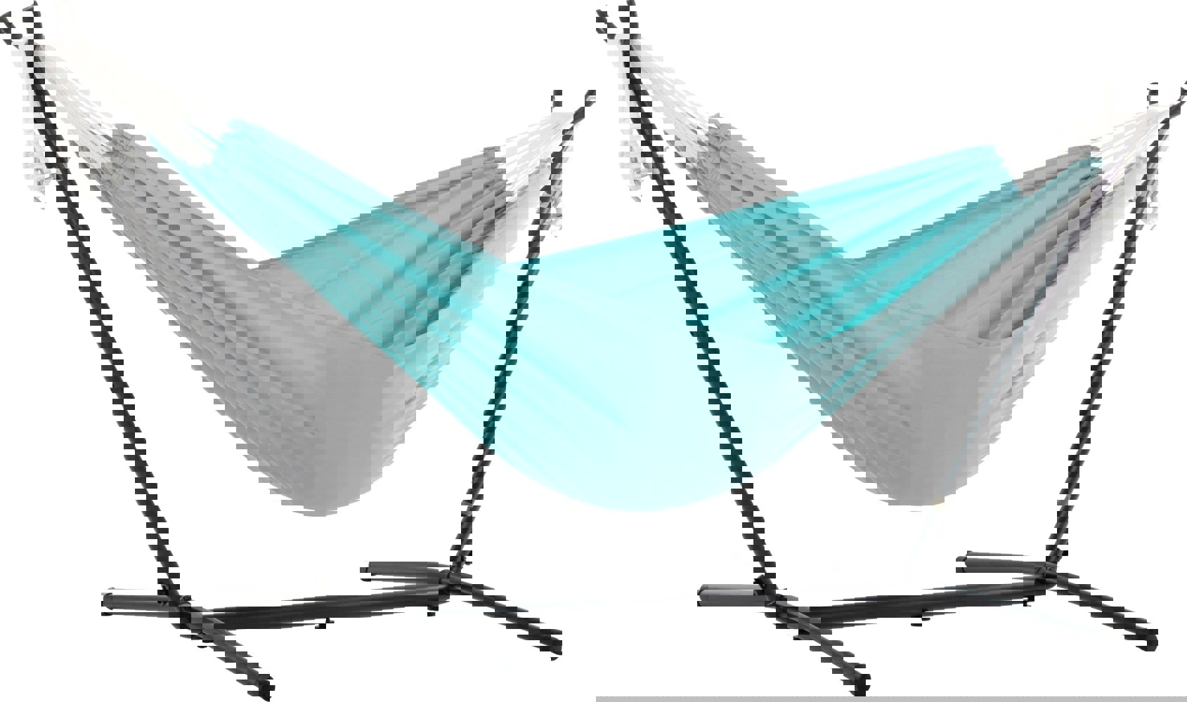 Introducing the best of both worlds, Vivere’s Double Polyester Hammock with Stand brings you the durability and saturated colour of woven polyester. This single-ply hammock fits on the easily assembled stand, no tools required. Rubber caps are fitted on all ends, allowing for a soft finish on whatever surface you choose for setup. Enjoy the freedom year after year that this product allows by locating it in the most convenient location. Easily moved to allow for sun or shade outdoor relaxation.