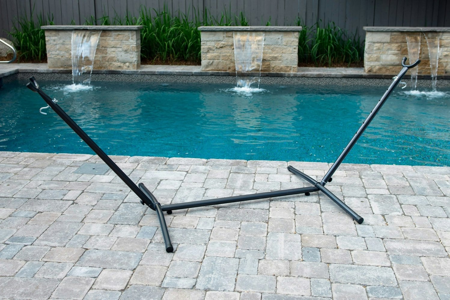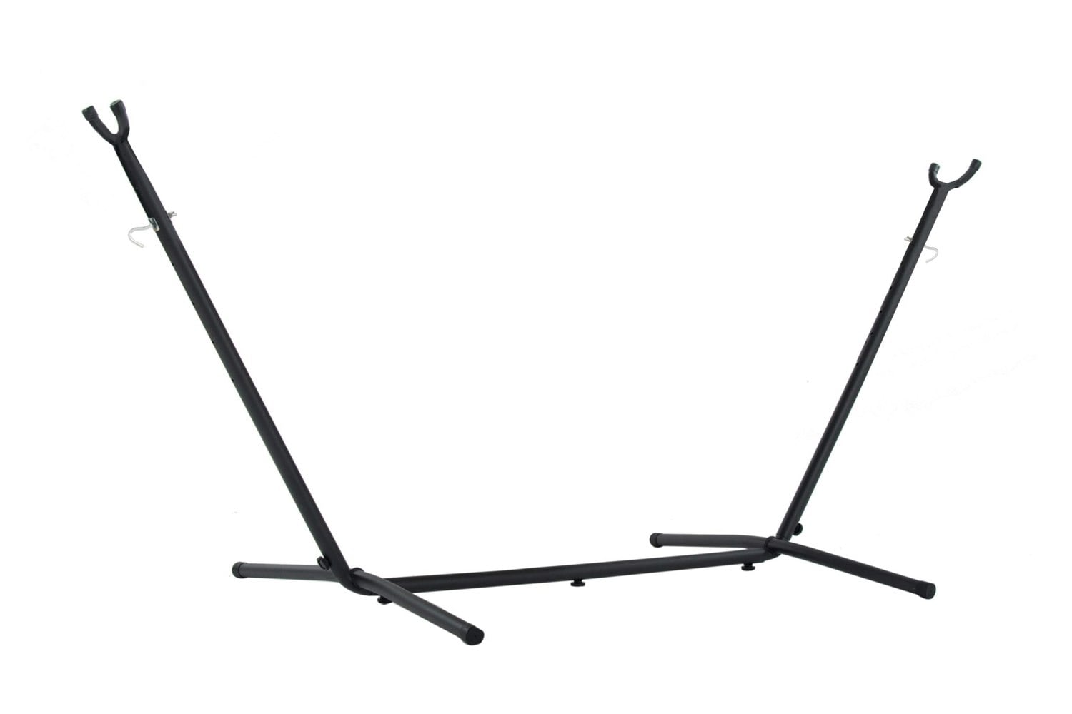 A powder coated finish supports durability, while plastic caps on the ends of the steel tubing create a softer finish. Adjustable hammock hooks let you choose how low or high you want to lie, helping you tailor the feel of your set-up. Rubber end caps are designed to allow safer indoor assembly, and a carry bag is included for easier transport and storage.