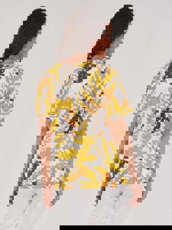 Step out in this vibrant cotton-modal top. It features a yellow and grey abstract print with a round neck, a boxy fit, and rolled-up short sleeves. The soft, breathable blend makes this a perfect easy-wear, lightweight top for any casual outing.