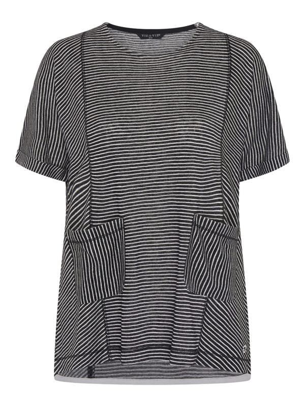 Chic top in a classic yarn-dyed stripe. Features a mix of horizontal and vertical stripes and 3/4 rolled-up sleeves. Unique details include two large front patch pockets and a curved hem. Soft and nautical-inspired.