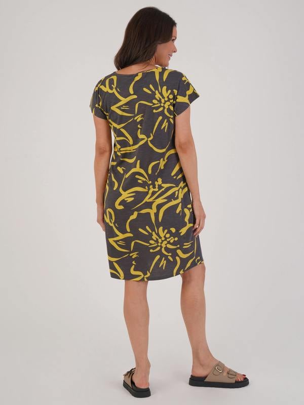 Comfortable cotton-modal dress featuring a bold abstract floral print in lime and charcoal. It has a relaxed T-shirt silhouette, cuffed short sleeves, a round neck, and a curved hem. Soft and easy to wear for a stylish casual look.