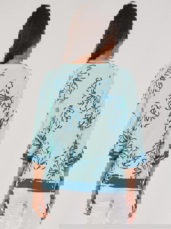 Elevate your casual wear with this viscose top in peppermint green. It features a bold teal floral sketch print, a round neck, 3/4 sleeves with cuff details, and a contrasting dark hem band. The lightweight fabric is comfortable and stylish.