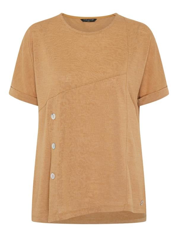 Modern flair defines this in a rich gold hue. It features a unique asymmetric front panel accented by decorative buttons. With a round neck, rolled-up short sleeves, and a boxy fit, it's a lightweight and chic choice for a contemporary look.