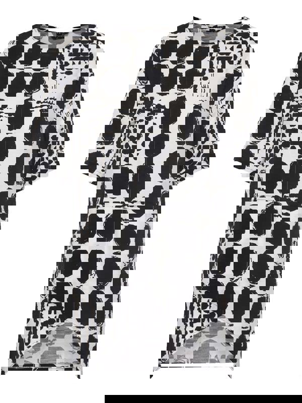 Bold, artistic style defines this viscose nylon top. It features a black and white hand-painted polka dot print and a unique two-layer design for a relaxed silhouette. The asymmetric hem adds a modern, eye-catching finish.