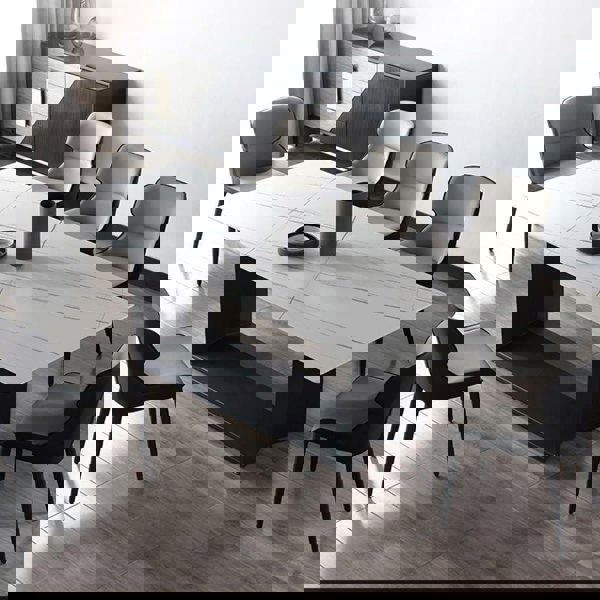 Made from sintered stone and metal, this table pairs a durable surface with a contrasting black base. It arrives with the legs to be fitted, making it straightforward to position in place before completing assembly.