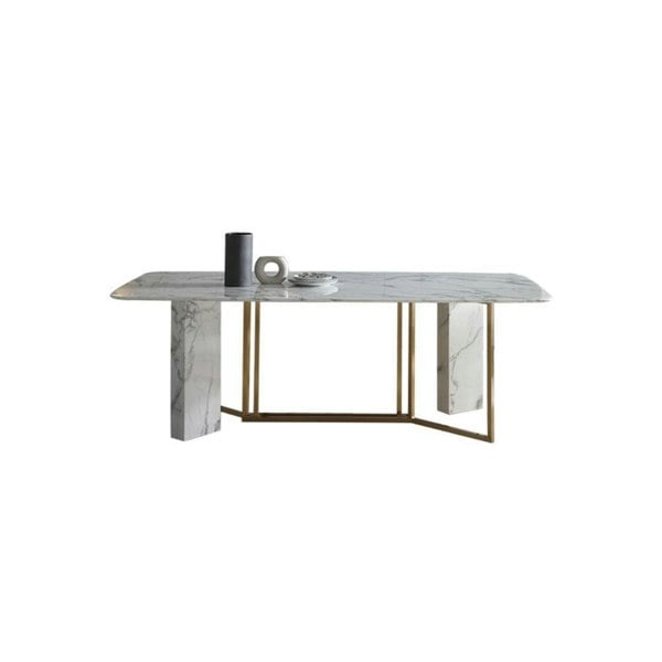 The Weilai Concept FenX dining table is a contemporary and modern piece designed for everyday dining spaces. Finished in white and gold, it pairs a sintered stone tabletop with painted steel for a clean, considered look.